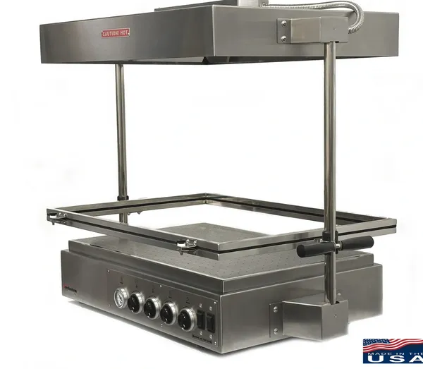 - Stainless steel welded and polished quick-load plastic frame (adjustable to accommodate different plastic thicknesses ) slides down quickly before plastic starts to cool